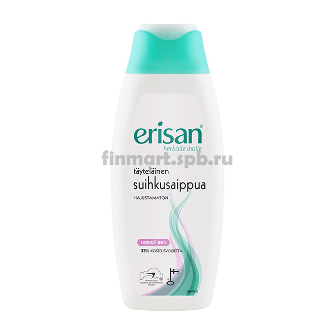 Erisan suihkusaippua - гель для душа для всего тела, мягко очищает кожу. 33% увлажняющая формула делает кожу бархатистой мягкой. Поддерживает нормальный баланс влажности кожи. Подходит для ежедневного использования всей семьи. Не содержит парфюмов, красителей или парабенов.