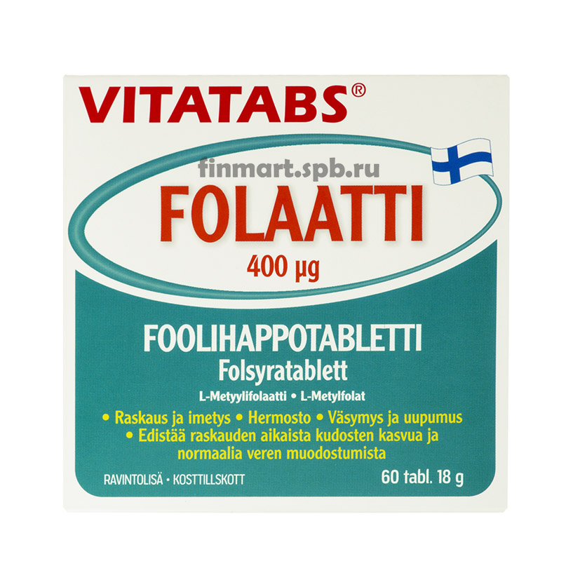 - Таблетки Vitatabs® Folaatti содержат по 400 мкг фолиевой кислоты или фолата (витамин B9). Фолат Quatrefolic®, входящий в состав этого препарата, представляет собой наиболее биологически активную форму фолиевой кислоты (L-метилфолат).