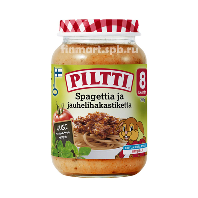 Готовое пюре PILTTI Spagettia ja jauhelihakastiketta - спагетти и мясной фарш. Возраст с 8-и месяцев.