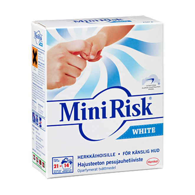Mini Risk White - гипоалергенный стиральный порошок для белых тканей, идеально подходит для стирки детских вещей, не содержит ароматизаторов.