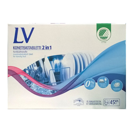 LV - моющее средство для посудомоечных машин, не содержит фосфатов, отдушек и красителей. Средство содержит ополаскиватель для придания блеска посуде. Капсулы находятся в защитной водорастворимой оболочке. Как и вся продукция компании LV одобренно ассоциацией алергии и астмы Финляндии
