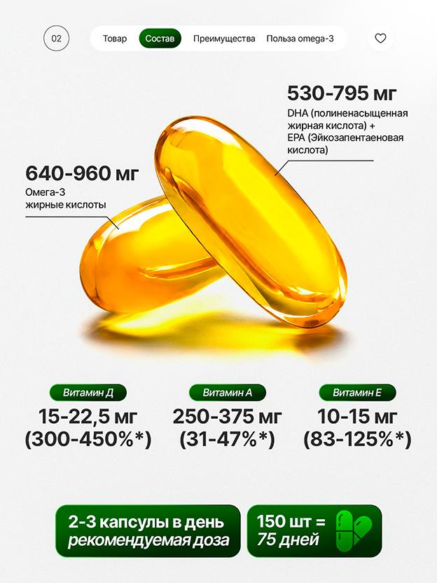 Компонент 2 капсулы/день 3 капсулы/день % от нормы (2 капс) Омега-3 жирные кислоты 650 мг 975 мг — — из которых EPA + DHA 540 мг 810 мг — Витамин D3 10 мкг 15 мкг 200% Витамин A 250 мкг 375 мкг 31% Витамин E 10 мг 15 мг 83%