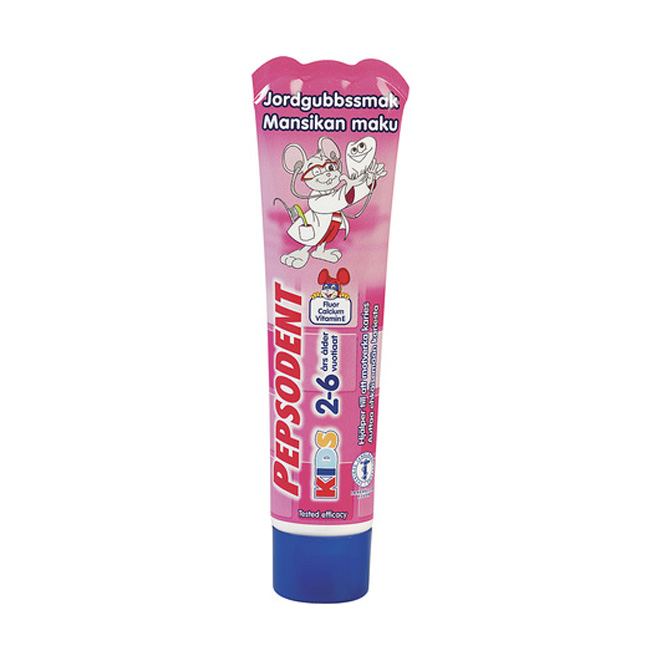 Pepsodent Kids - зубная паста со вкусом клубники, пониженным содержанием фтора и абразивных вещест, специально разработана для детей от 2 до 6 лет.