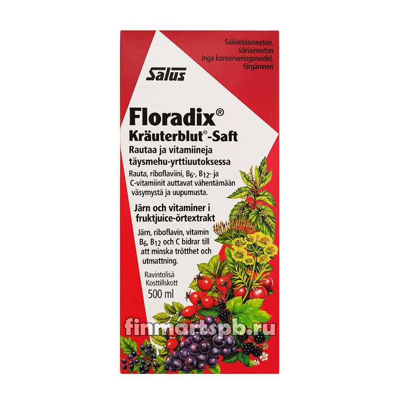 Суточная доза 20 мл содержит: железо (ферроглюконат) 15 мг, витамин С 26 мг, витамин В1 1,6 мг, витамин В 1,8 1,8 мг, витамин В6 0,8 мг, витамин В12 1,2 микрограмма. Ингредиенты: водный экстракт следующих трав (54%): морковь (Daucus carota), крапива (Urtica dioica), лист шпината (Spinacia oleracea), крыжовник (Agropyron repens), семена фенхеля (Foeniculum vulgare), коричневатый (Macrocystis pyriabrara), гребешок (Hib). ), смесь следующих концентратов фруктовых соков (29,4%): груша, виноград, ежевика, вода, ежевика, вишня, апельсин, свекла, лимон, экстракт рожкового дерева, яблоко, экстракт водных дрожжей, мед, экстракт шиповника, глюконат железа, экстракт зародышей пшеницы, L- аскорбиновая кислота, нативный аромат, тиамин гидрохлорид, натрия рибофлавин-5'-фосфат, пиридоксин гидрохлорид, цианокобаламин. -